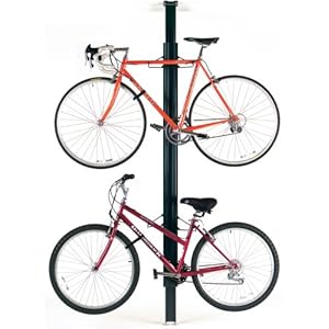 Product Description : Gear Up floor racks for display and storage.The Gear Up Floor-to-Ceiling aluminum bike rack utilizes a patented "no holes" tension mounting system to hold 2 bikes in an apartment, office, garage, or almost anywhere there is a flat, solid ceiling. The top and bottom extenders adjust independently to accommodate ceiling heights from 7 to 11 ft. The padded feet grip any surface and the top plate has foam to protect the ceiling. The storage arms adjust independently over a 6' track area to fit almost any style of bikeVelcro straps included stabilize front wheel to frame when bikes are in storage position. Comes equipped with everything to hold 2 bikesHolds up to 4 bikes with optional Add-A-Bike kitsAssembled dimensions 7'-11' tall, 14-1/2" wide, and 9-1/2" deepAircraft grade anodized aluminum will not rust or corrodeArms adjust independently to accommodate different style framesNon-permanent tension mount design fits ceilings 7 - 11'200 lb capacityMade in the USA